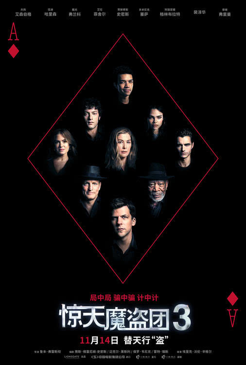 一同发布的“再现王炸”版海报中,方块A牌面之上,“初代骑士团”成员、摩根·弗里曼携三位新生代魔术师亮相,神情坚毅、气场全开,将“钻石财阀”裴淳华层层围困。一场围绕“史上最贵钻石”的惊天对决已经拉开序幕。“骑士团”以魔术为刃,誓要撕开裴淳华背后操控的全球犯罪网络的血色黑幕;而裴淳华饰演的财阀冷面迎战,眼神凌厉如刀,分毫不让。明暗光影交错间,双方暗流涌动,对峙张力拉满,仿佛下一秒就要引爆银幕!钻石或许永恒,但魔术,更能创造奇迹!11月14日,邀你共赴影院,揭晓这场爽“骗”到底的终极胜负!